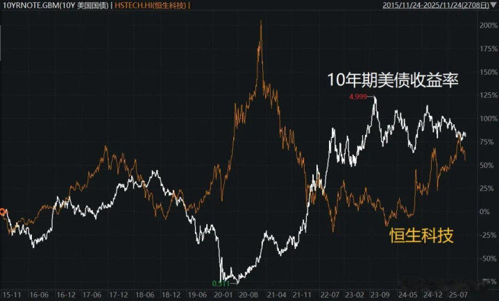 你们看下面这个对比图就比较清晰了,恒生科技的走势,跟10年期美债收益率,整体上是非常显著的反向关系。