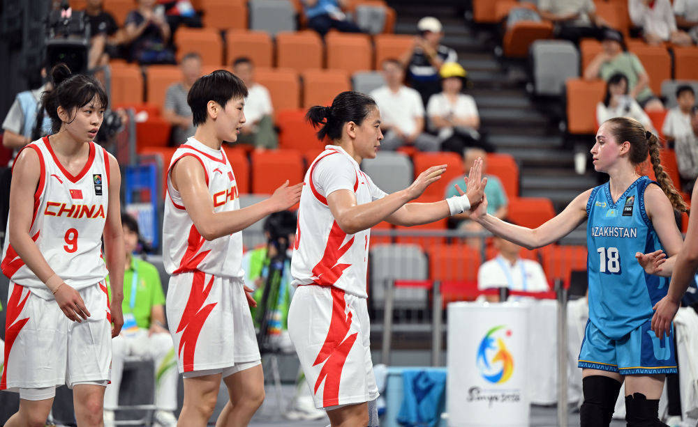 4月25日,中国队球员在比赛后与哈萨克斯坦队球员击掌。新华社记者 郭程 摄