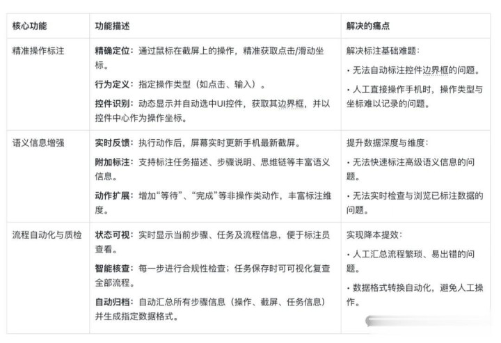 其核心价值是通过一体化标注方案,系统性解决了屏幕交互数据制作中的效率、精度与成本难题,该工具核心功能如下: