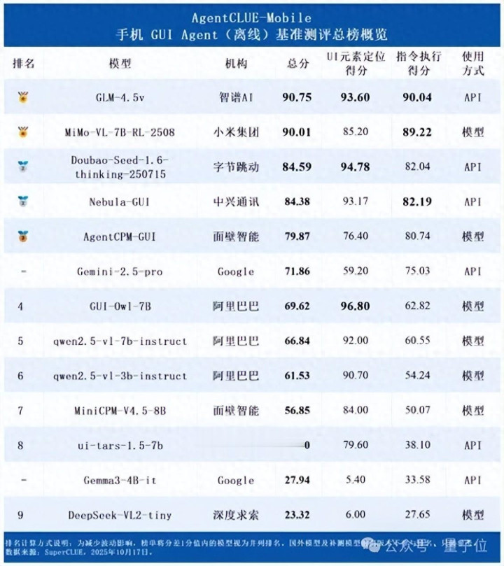 据2025年10月17日SuperCLUE发布的AgentCLUE-mobile手机GUI Agent(离线)基准测评数据显示,中兴通讯Nebula-GUI模型以7B参数量斩获总榜银牌,总分84.38,其中UI元素定位得分93.17,尤其在自动点餐、订票等复杂任务中,其准确率与操作速度远超业界其他模型,充分具备手机端侧部署落地能力。