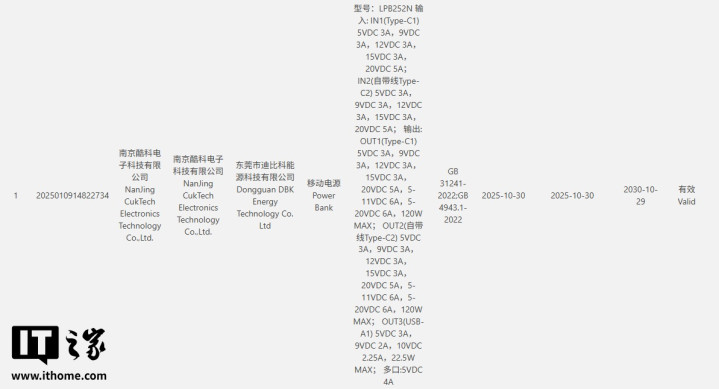 IT之家注意到,酷态科10月30日有一款型号为LPB252N的移动电源新品通过了3C认证,各接口功率分布如下: