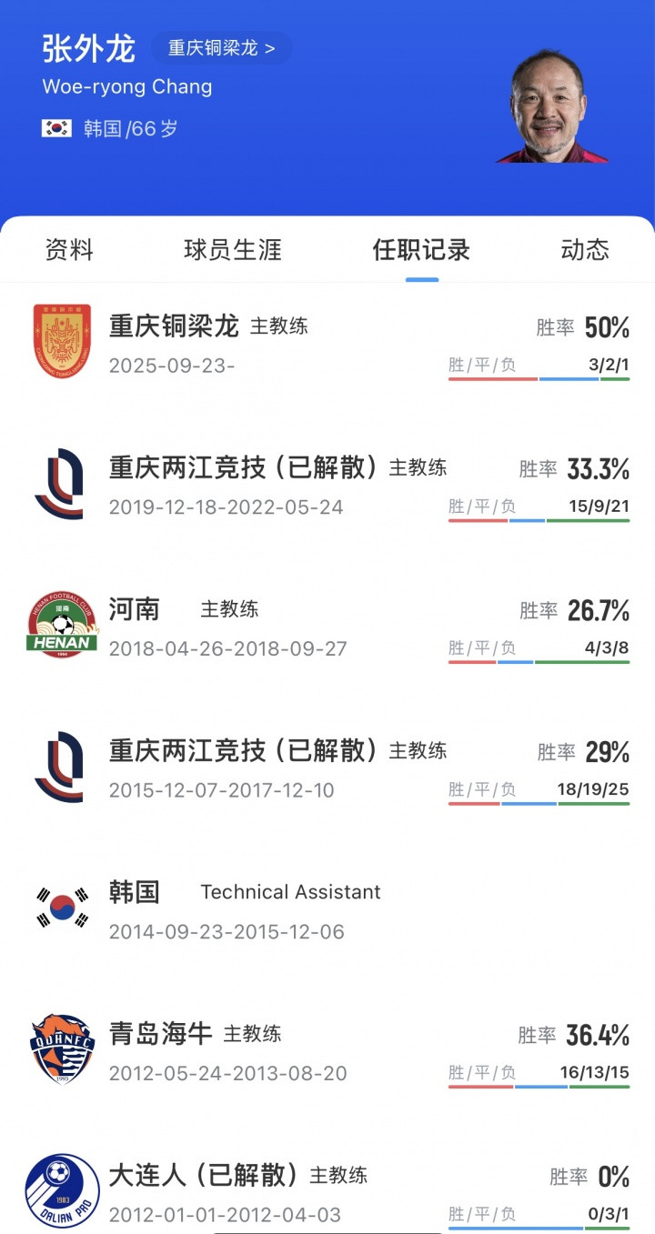 韩国籍教练张外龙与中超颇有渊源,此前他已经执教过4支中超球队,分别是:青岛海牛、大连人(已经解散)、河南队、重庆两江竞技(已经解散)、重庆铜梁龙。