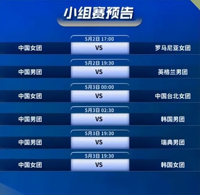 北京时间5月2日17:00,女团首战罗马尼亚,19:30,男队迎战东道主英格兰,两场比赛作为开胃菜,帮助队伍适应赛场节奏、找回比赛感觉。